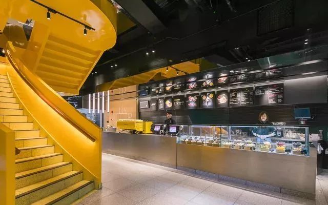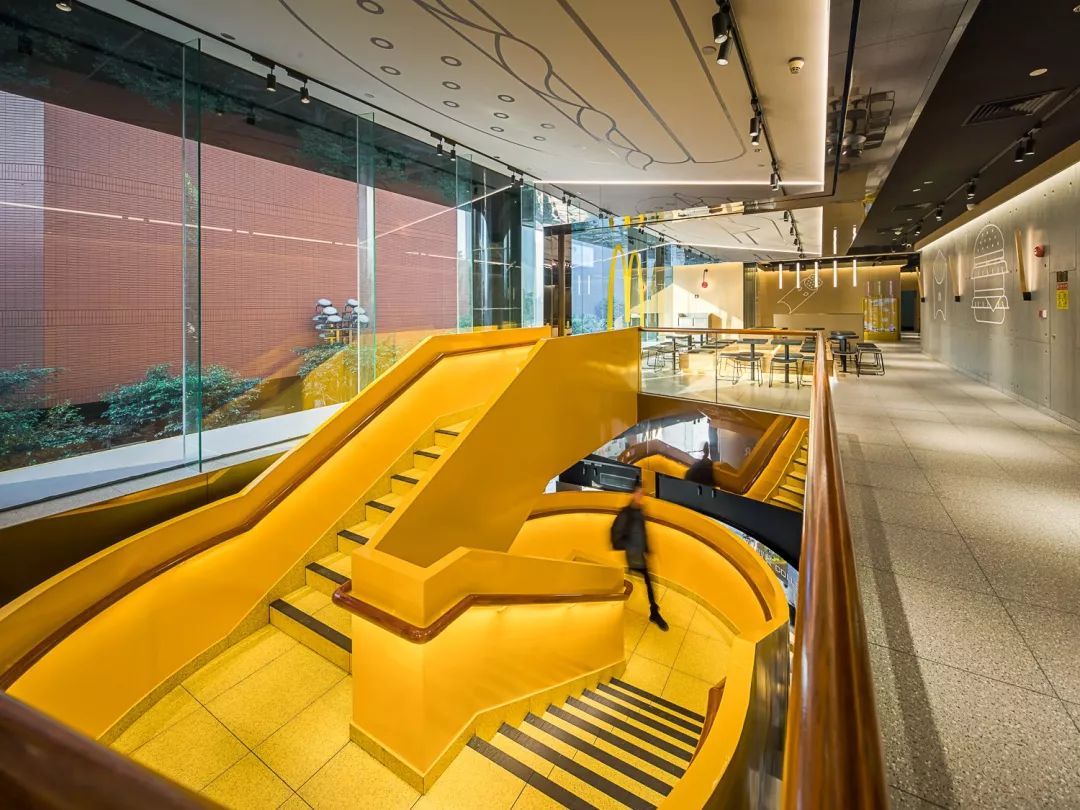 这个未来店分两层,简约、现代及工业风的设计,主色调是亮眼的M记“黄”