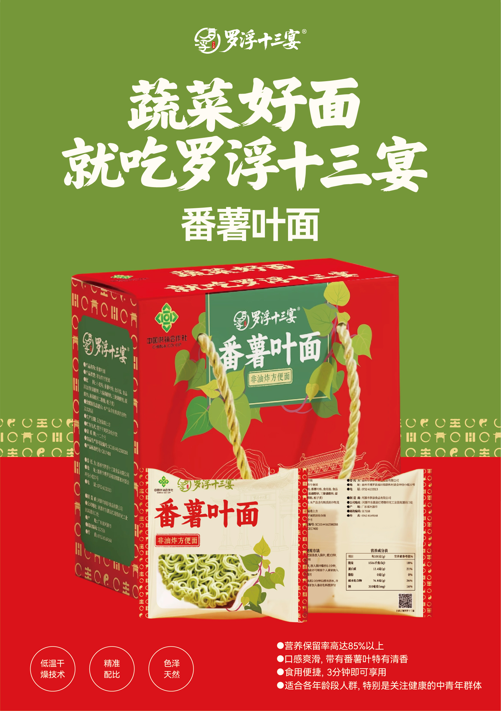 核心视觉符号:大面积菜心插画(绿色)与红色背景形成强烈对比,直观传递“蔬菜面”的产品特性,降低消费者认知成本;罗浮山门楼剪影强化地域文化符号,与“罗浮十三宴”品牌名形成呼应,增强文化信任感。